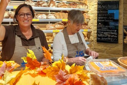 Die Bensheimer Rathauschefin Christine Klein (rechts) betätigt sich als Bäckereifachverkäuferin – hier im Ladengeschäft der Weststadtbäckerei Jakob in Bensheim – und macht damit auf die Th...