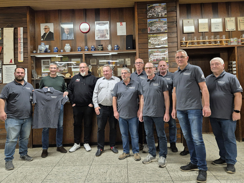 Bei der Übergabe der Trikots anlässlich einer Probe im Dorfgemeinschaftshaus Lauerbach durch die Spender an Mitglieder der Dorfkapelle: die drei Uhrigs – Kai Uhrig (Firma Klinger, Bad König), Jürgen Uhrig (Firma A-Z, Michelstadt) ...