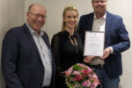 Bürgermeister Jens Fröhlich (rechts) und Kulturamtsleiter Axel Muhn gratulieren Chiara Fischer zur Krönung zur 72. Gebietsweinkönigin der Hessischen Bergstraße mit einer Glückwunschurkunde der Gemeinde Höchst und einem Blumenstrau...