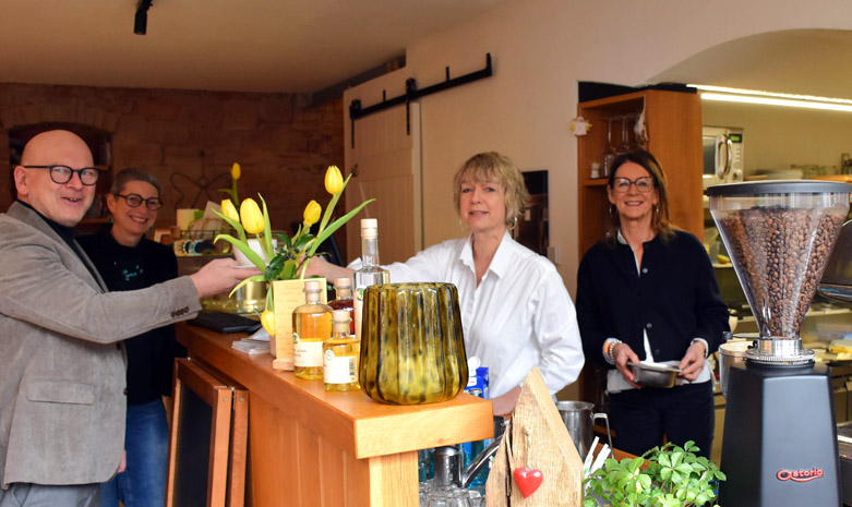 Gut gelaunt: Landrat Frank Matiaske und Brigitte Lachnit (links), Leiterin der Abteilung Dorf- und Regionalentwicklung, besuchten das Café Endlich in Bad König. Betrieben wird es von Gabriele Carnier, die dem Landrat eine Tasse Ka...