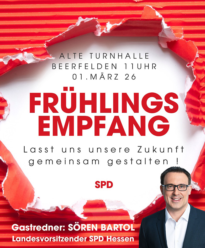 20. Januar 2026Sören Bartol, Landesvorsitzender der SPD Hessen, kommt am Sonntag, 1. März 2026, um 11 Uhr, in die Alte Turnhalle nach Beerfelden Dr. Michael Hüttenberger ODENWALDKREIS / BEERFELDEN. – Der Odenwald ist unsere Heimat. Hier leben wir. Hier arbeit...