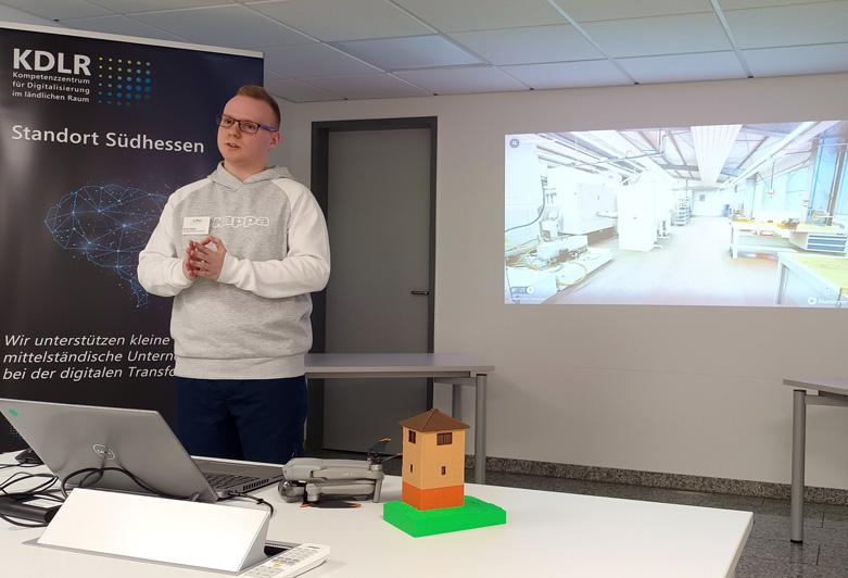 Fachmann: Kevin Seipel vom Lern- und Forschungszentrum Odenwald. Er war bei allen drei Veranstaltungen als Referent dabei. Hier stellt er den Digitalen Zwilling der Werkzeug- und Formenbau Vogel GmbH vor. Foto: Sandra Stabolidis/W...