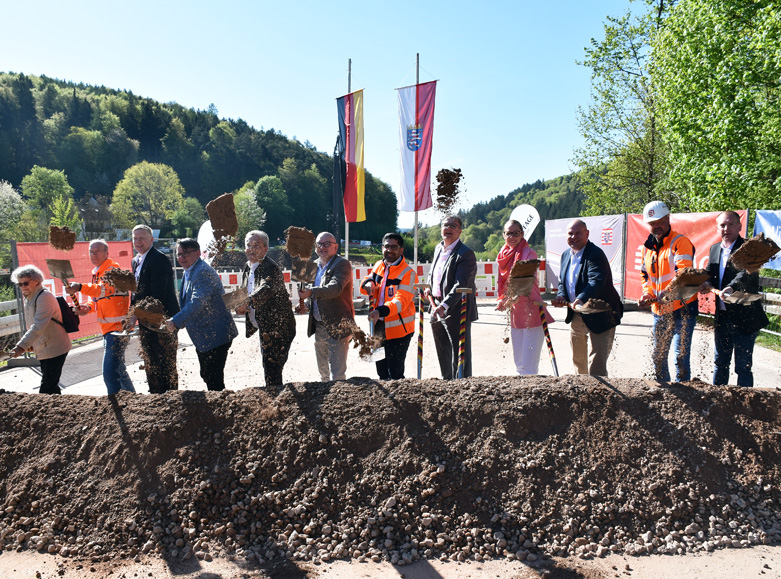Nehmen den Spatenstich an der Zeller Brücke vor: Gerlinde Freiling (Anwohnerin aus Zell und Stadtverordnete in Bad König), Markus Schmitt und Heiko Durth (beide Hessen Mobil), Dr. Tobias Robischon (Bürgermeister Michelstadt), Andr...