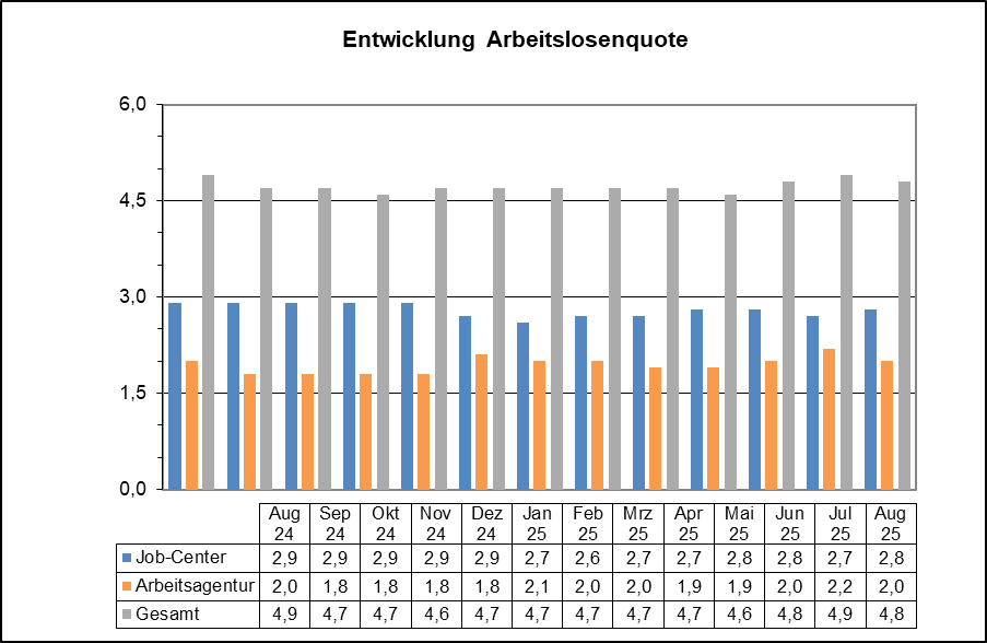 Betrachtet man die beiden Rechtskreise getrennt voneinander, ist im Vergleich zum Juli 2025 in der Zuständigkeit des Kommunalen Job-Centers (SGB II) ein Anstieg um 42 Personen auf 1.478 Personen zu verzeichnen (Vorjahresmonat 1.524). Im Zuständigkeitsbereich der Agentur für Arbeit Michelstadt (SGB III) waren im August 1.040 Personen arbeitslos gemeldet.