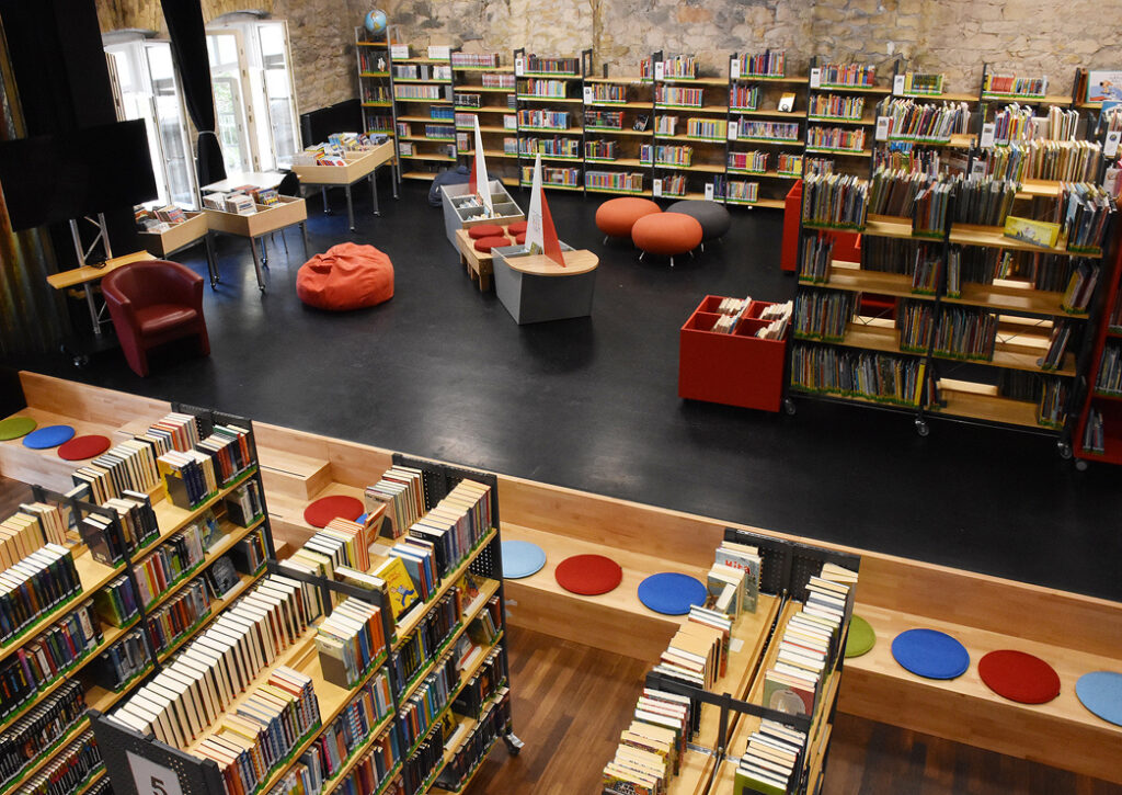 Mehr als 12.000 Bücher, Zeitschriften, CDs, DVDs und Tonies sind in den hellen und freundlichen Räumen untergebracht. Der große Saal bietet Platz für Romane und Belletristik, während auf der Bühne die farbenfrohe Kinder- und Jugendabteilung eingerichtet wurde.