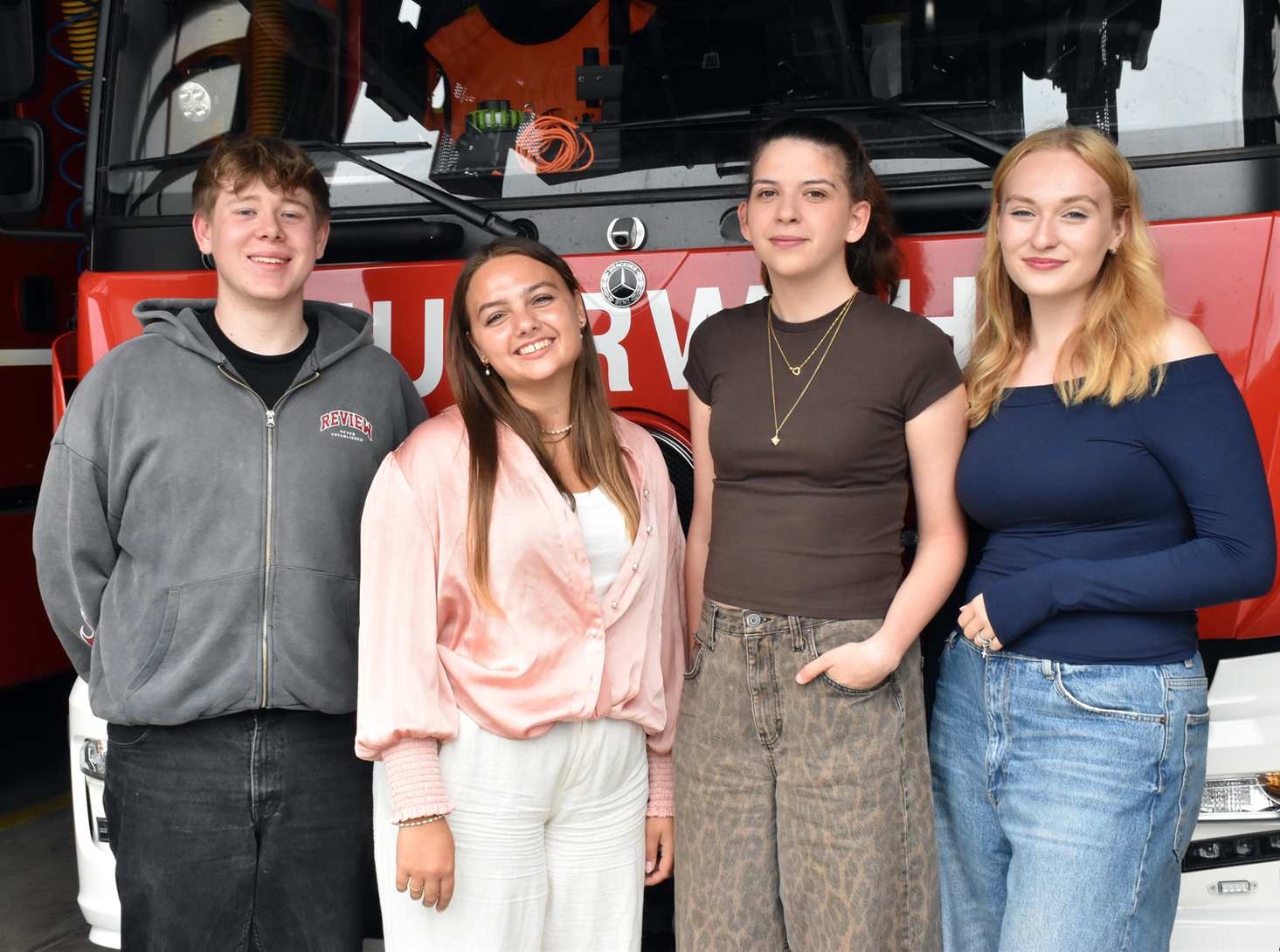 Ein Teil der städtischen Auszubildenden und Studierenden beim Besuch des Feuerwehrstützpunkts in Bensheim: Luc Stuckert, Samira Kaiser, Sophie Weinkötz und Dana-Zoé Heim (von links). Foto: Pressedienst Bensheim
