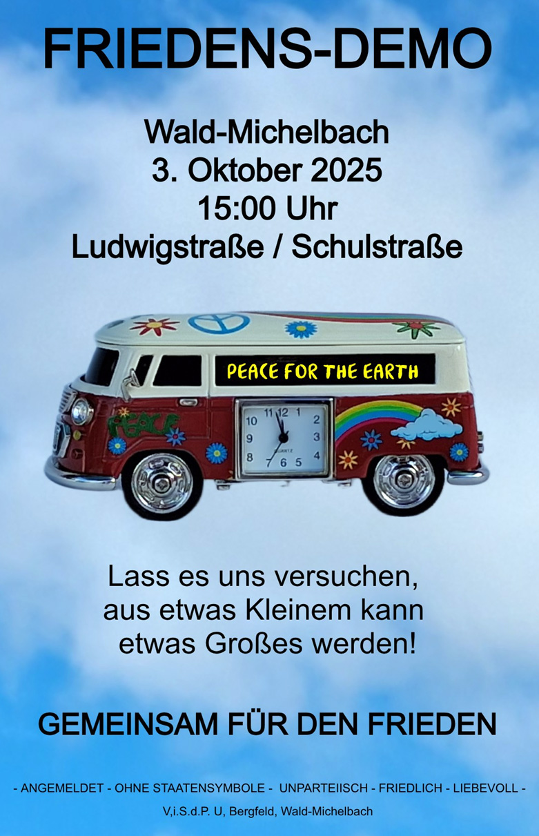 WALD-MICHELBACH. – Zur Wald-Michelbacher Friedensdemo laden Udo Bergfeld und sein Team am Tag der Deutschen Einheit, Freitag, 03. Oktober 2025, ab 15 Uhr, in die Ludwigstraße/Schulstraße nach Wald-Michelbach ein.
