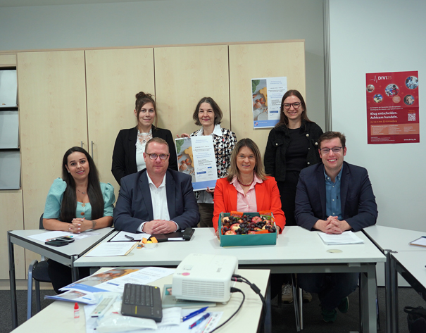 Die Erste Kreisbeigeordnete und Gesundheitsdezernentin Angelika Beckenbach (untere Reihe, 2. von rechts) informiert gemeinsam mit dem hauptamtlichen Ersten Stadtrat Lampertheims Marius Schmidt (rechts daneben), Geschäftsführer des St.-Marien-Krankenhauses Florian Busse (links daneben), Selina Werner-Celikkan, Referentin der Geschäftsführung, sowie die PauLa‘s Christina Adler-Schäfer (obere Reihe, 2. von links) und Michaela Weber (obere Reihe, links) sowie Jennifer Jarke, Fachbereichsleitung vom Gesundheitsamt des Kreises (obere Reihe, rechts), über die Knochenkrankheit Osteoporose. Foto: Pressedienst Bergstraße