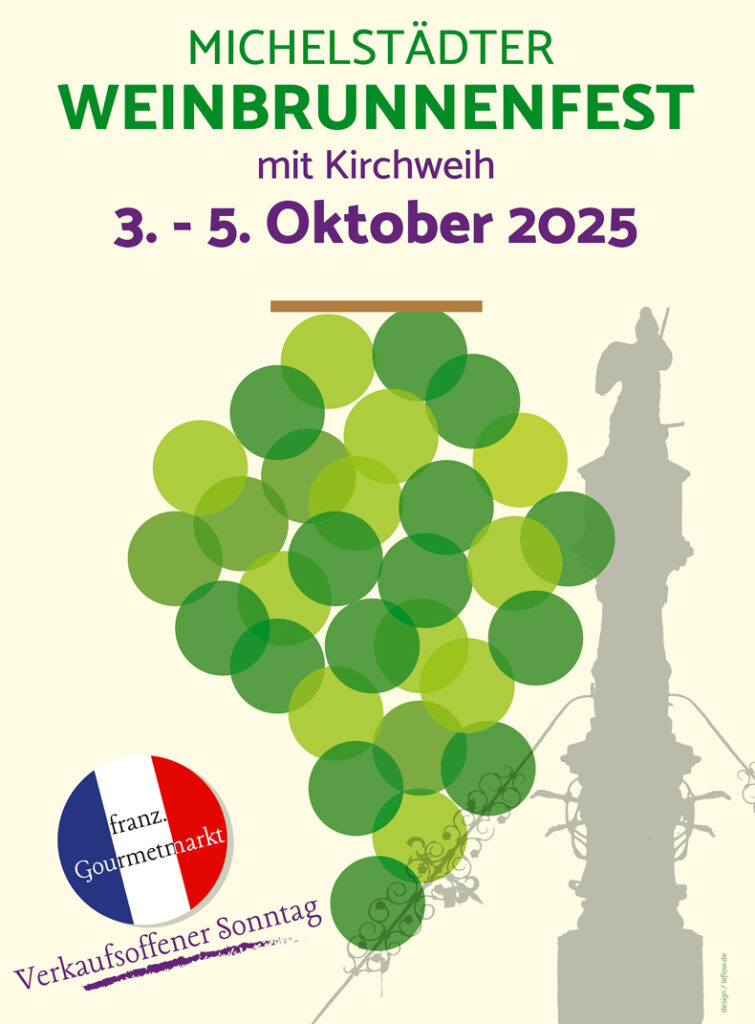 Das Michelstädter Weinbrunnenfest beginnt am Freitag, 3. Oktober, um 11 Uhr mit dem Bierfrühschoppen und dauert bis Sonntagabend, 5. Oktober. Der Eintritt ist frei. Weitere Informationen und das vollständige Programm gibt es unter www.michelstadt.de.