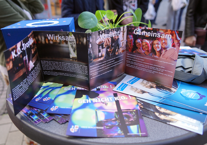 Angesichts der hohen Dunkelziffer hat die Erste Kreisbeigeordnete und Gesundheitsdezernentin Angelika Beckenbach gemeinsam mit dem Präventionsteam des Kreises sowie Kooperationspartnern mit einer gezielten Öffentlichkeitskampagne unter dem Motto „Feiern, aber sicher – wir passen aufeinander auf!“ auch am Rande des Bensheimer Winzerfestes über die Gefahren von K.O.-Tropfen aufgeklärt.