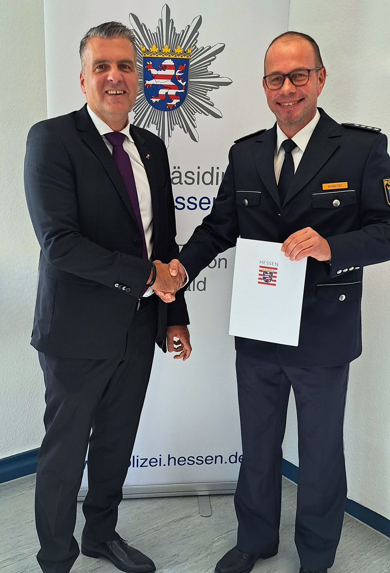 HÖCHST. – Polizeihauptkommissar Mario Nowotny ist der neue Leiter der Polizeistation Höchst. Im Kreis zahlreicher Gäste in den Räumen der Polizeistation übertrug Polizeivizepräsident Dirk Fornoff dem erfahrenen Polizeibeamten am Montag, 29. September, offiziell die Leitung der Dienststelle. Damit übernimmt Mario Nowotny die Nachfolge der Ersten Kriminalhauptkommissarin Michaela Schmelzer, die kürzlich ihren wohlverdienten Ruhestand antrat.