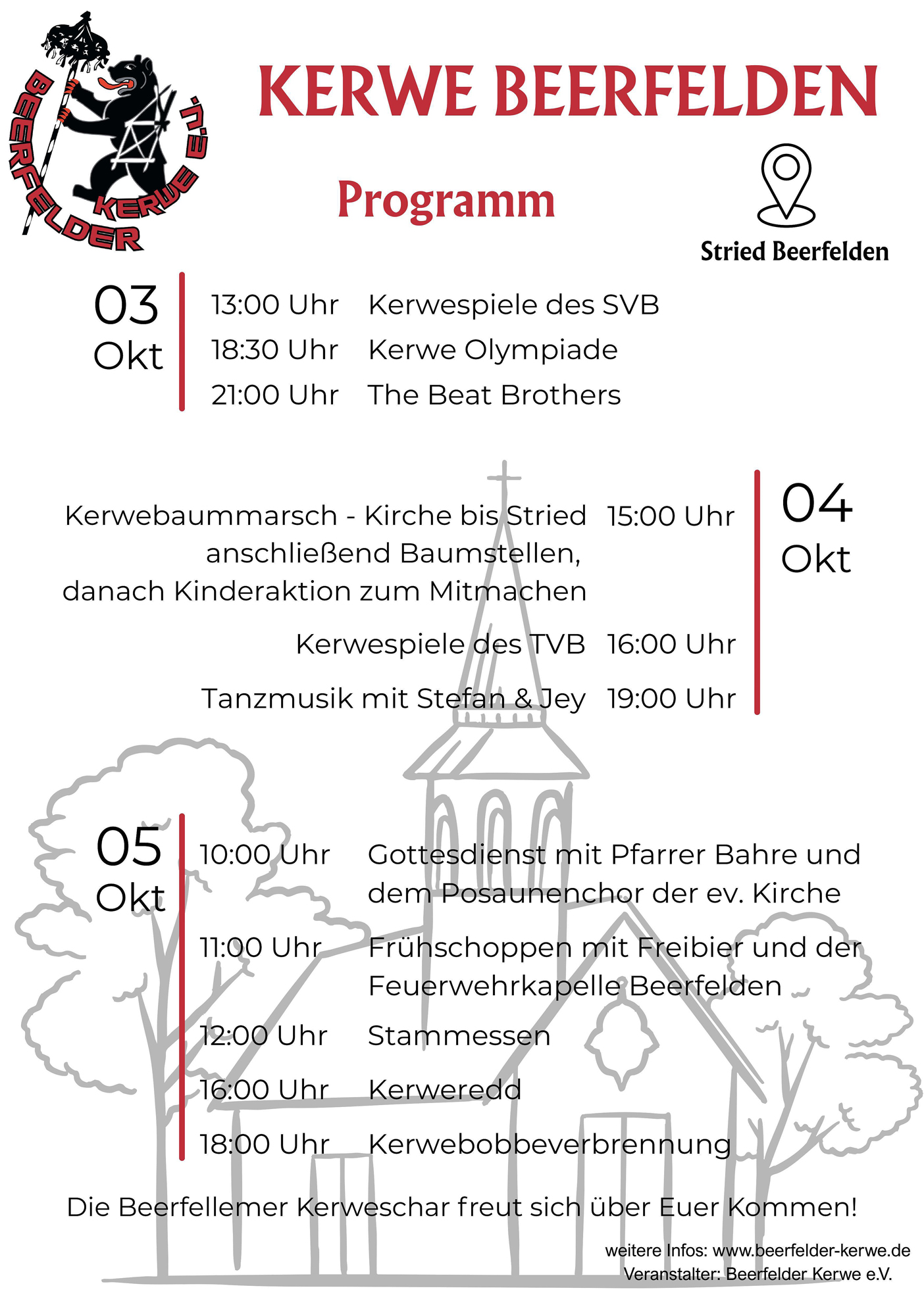 Los geht’s am Tag der Deutschen Einheit, Freitag, 03. Oktober, ab 13 Uhr, mit Kerwespielen des SV Beerfelden. Ab 18:30 Uhr folgt eine „Kerwe-Olympiade“, ehe ab 21 Uhr >The Beat Brothers< für die richtigen Rhythmen sorgen werden.