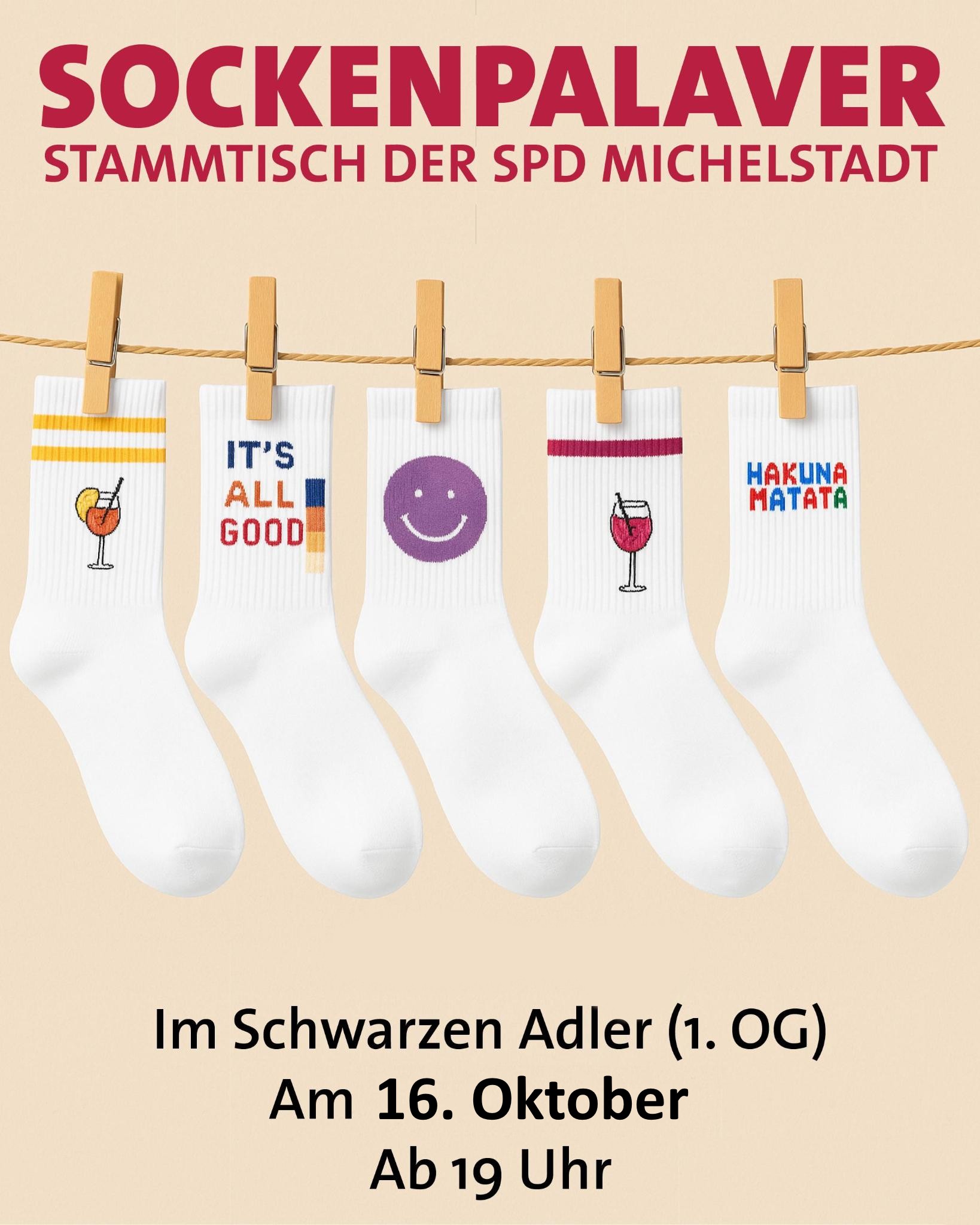 MICHELSTADT. – Die SPD Michelstadt lädt ihre Mitglieder und alle Interessierten am Donnerstag, 16. Oktober, ab 19 Uhr sehr herzlich ein zum nächsten „Sockenpalaver“ ins Apfelweinhaus „Zum Schwarzen Adler“ in Michelstadt.