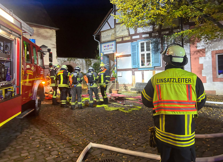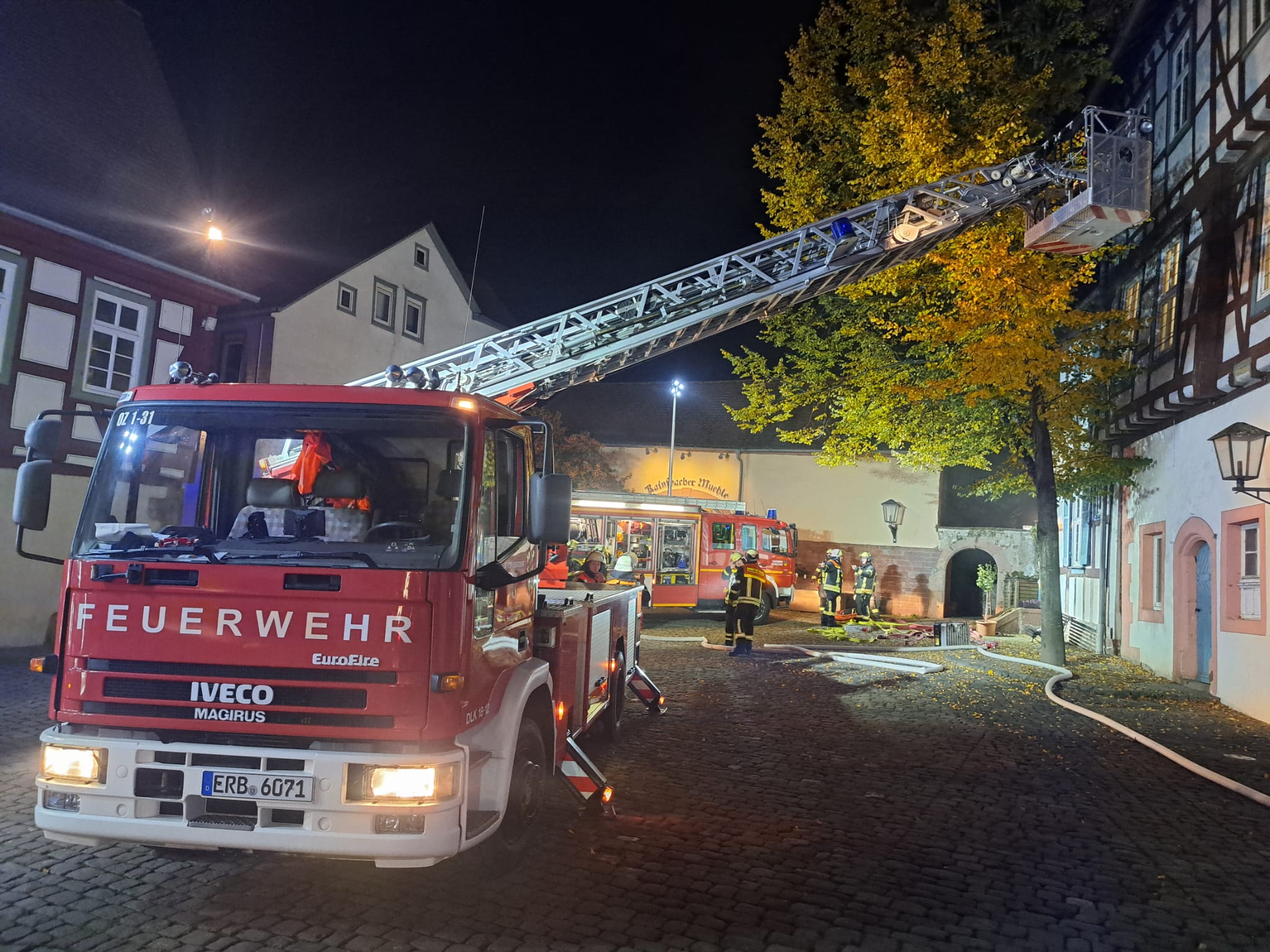 Sofort wurden zwei Trupps zur Menschenrettung ins Gebäude geschickt. Die aufgrund der engen Bebauung in der Altstadt mitalarmierte Drehleiter der Feuerwehr Beerfelden unterstützte die Brandbekämpfung und Menschenrettung.