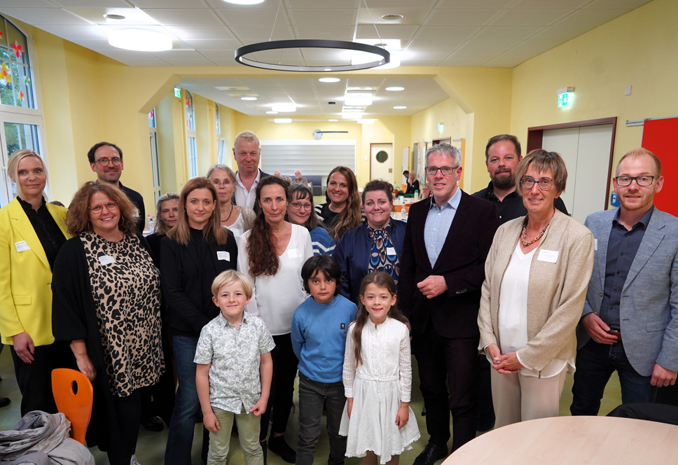 Landrat Christian Engelhardt (4. von rechts) mit den Teilnehmern der Jubiläumsveranstaltung „Zehn Jahre Pakt für den Nachmittag“ an der Schillerschule Viernheim: Kathrin Schnalle (Hessisches Ministerium für Kultus, Bildung und Chancen), Stefanie Brand (Leiterin der Schillerschule Viernheim), Michael Schmitt (Leiter Serviceagentur Ganztag Hessen), Christin Zweigler (Lernmobil e. V.), Simone Kurt (bisherige Leiterin Felsenmeerschule Lautertal-Reichenbach), Christine Marx (Leiterin Carl-Orff-Schule Bensheim-Fehlheim), Markus Proksch (Staatliches Schulamt Bergstraße/Odenwald), Beate Lammer (stellvertretende Leiterin Adam-Karillon-Schule Wald-Michelbach), Ulrike Babist (Leiterin Sonnenuhrschule Birkenau), Madeleine Kuschel (stellvertretende Leiterin Felsenmeerschule Lautertal-Reichenbach), Christine Lösch (stellvertretende Leiterin Schillerschule Bensheim), Marc Colin (Vertretung der kaufmännischen Abteilungsleitung Eigenbetrieb Schule und Gebäudewirtschaft), Claudia Blume (Sachgebietsleiterin Schulverwaltung- und Entwicklung beim Eigenbetrieb Schule und Gebäudewirtschaft des Kreises) und Johannes Kühn (Technischer Leiter Eigenbetrieb Schule und Gebäudewirtschaft des Kreises).