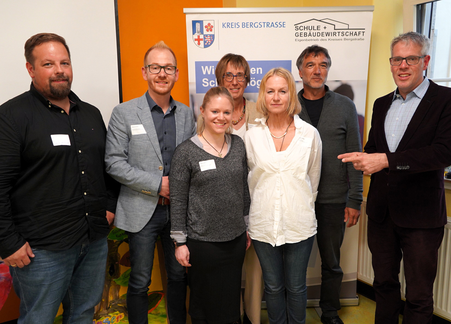 Landrat Christian Engelhardt (rechts) mit dem Team des Eigenbetriebes Schule und Gebäudewirtschaft, das den Pakt für den Ganztag für den Schulträger organisiert: der Vertreter der kaufmännischen Leitung des Eigenbetriebes Schule und Gebäudewirtschaft Marc Colin, der Technische Leiter des Eigenbetriebes Johannes Kühn, Sachbearbeiterin Johanna Wolf, Sachgebietsleiterin Schulverwaltung- und Entwicklung Claudia Blume, Sachbearbeiterin Barbara Ludwig und Stefan Baumgardt (Jugendamt Kreis Bergstraße, von links). Fotos: Pressedienst Bergstraße