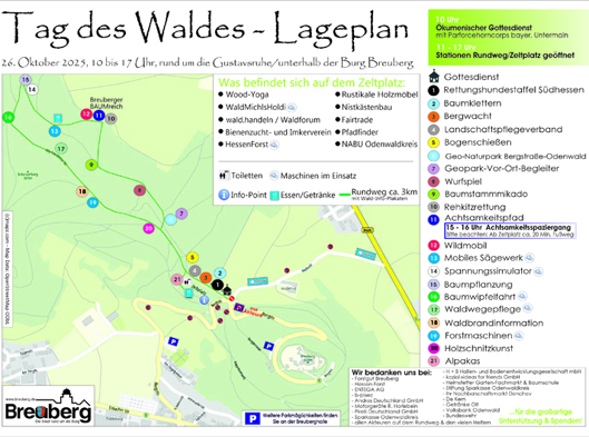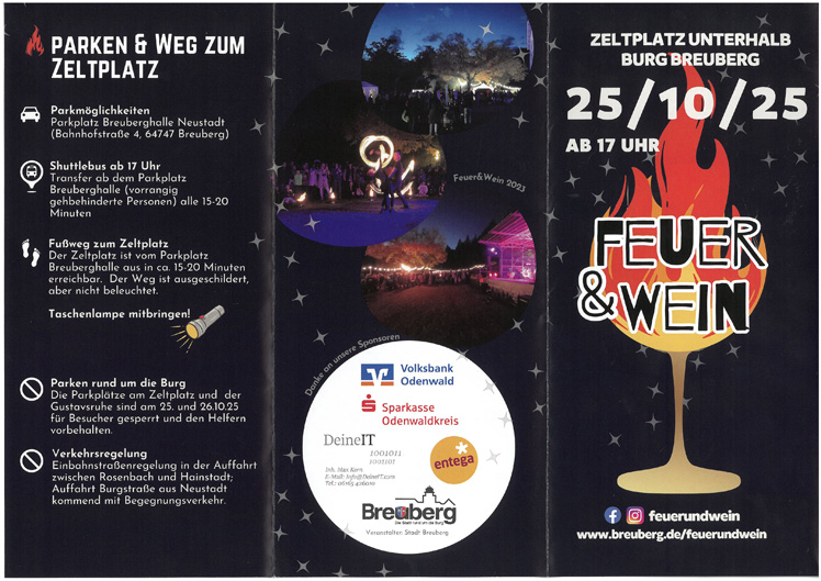 Auch an diesem Tag ist der Parkplatz Gustavsruhe für Besucher gesperrt und nur für Akteure zugelassen. Parkmöglichkeiten gibt’s auch an diesem Tag an der Breuberghalle bzw. vor der Festhalle (Bahnhofstraße 4, in Breuberg). Die Verkehrsregelung bleibt die gleiche wie bei Feuer & Wein.