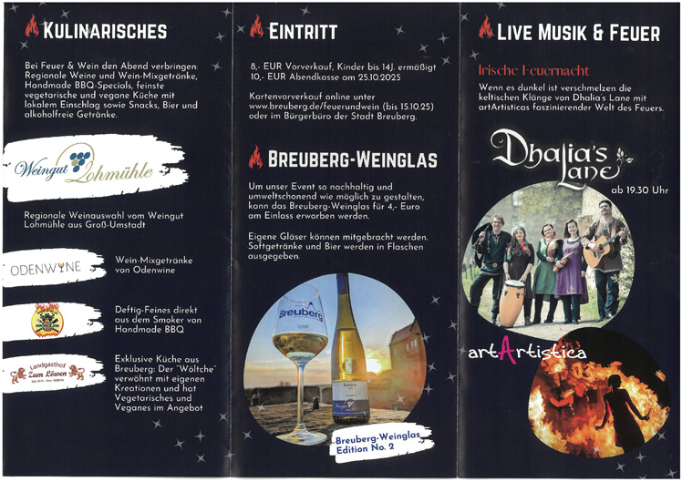 BREUBERG. – Das letzte Oktober-Wochenende beginnt am Samstag, 25. Oktober, ab 17 Uhr mit dem beliebten Event Feuer & Wein in Breuberg. Bereits zum dritten Mal verwandelt sich der Zeltplatz unterhalb der Burg Breuberg in ein buntes Lichtermeer mit Musik: die Irische Feuernacht mit den Klängen von Dhalia´s Lane gepaart mit artArtisticas faszinierender Welt des Feuers verschmelzen.
