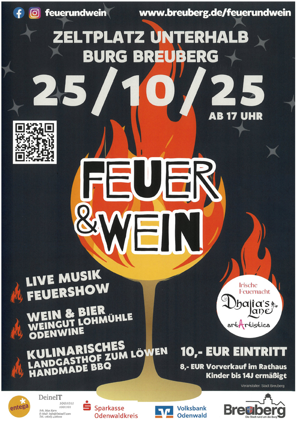 BREUBERG. – Das letzte Oktober-Wochenende beginnt am Samstag, 25. Oktober, ab 17 Uhr mit dem beliebten Event Feuer & Wein in Breuberg. Bereits zum dritten Mal verwandelt sich der Zeltplatz unterhalb der Burg Breuberg in ein buntes Lichtermeer mit Musik: die Irische Feuernacht mit den Klängen von Dhalia´s Lane gepaart mit artArtisticas faszinierender Welt des Feuers verschmelzen.