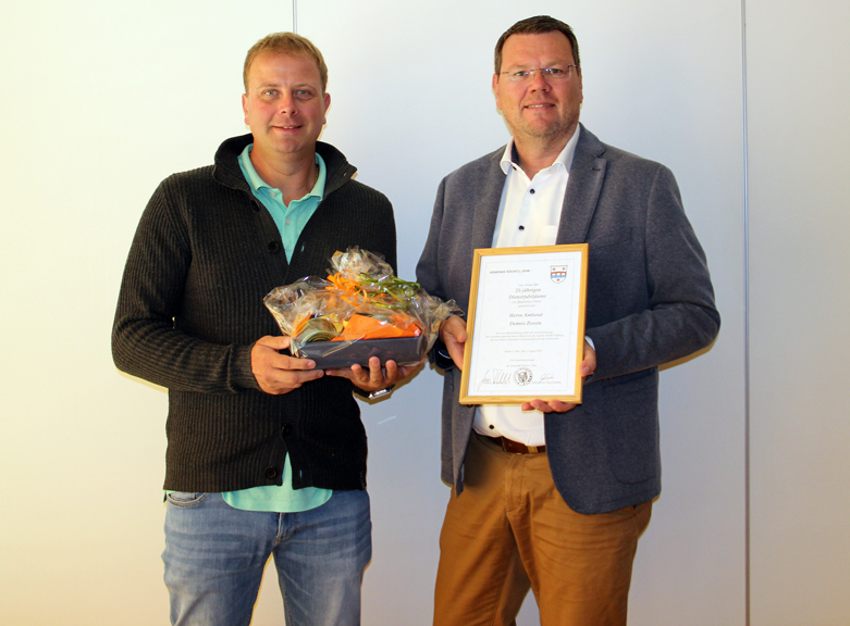 Für 25 Jahre Tätigkeit im öffentlichen Dienst wurde Amtsrat Dennis Zessin (links) durch Bürgermeister Jens Fröhlich mit einem Präsent und einer Urkunde geehrt. Foto: Pressedienst Höchst