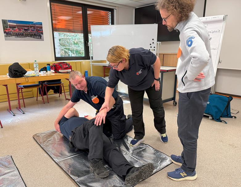 Auch das Vorgehen bei bewusstlosen Personen wurde geübt: Ansprache, Prüfen der Atmung, Absetzen des Notrufs über 112, und – falls erforderlich – die Herzdruckmassage. Wichtig ist dabei der richtige Rhythmus.