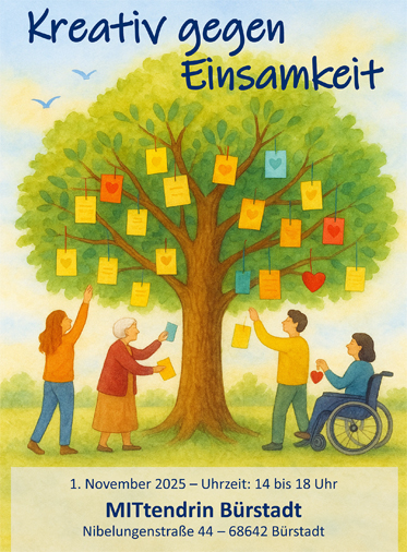 Und genau hier setzt die Veranstaltung der Ergänzenden unabhängigen Teilhabeberatung (EUTB®) Bergstraße-Odenwald an mit >Kreativ gegen Einsamkeit< am Samstag, 1. November, von 14 bis 18 Uhr, im MITtendrin Bürstadt, Nibelungenstraße 44, in Bürstadt. Schirmherr der Veranstaltung ist Boris Wenz, Bürgermeister der Stadt Bürstadt. Die Teilnahme ist kostenlos, barrierearm & inklusiv gestaltet.