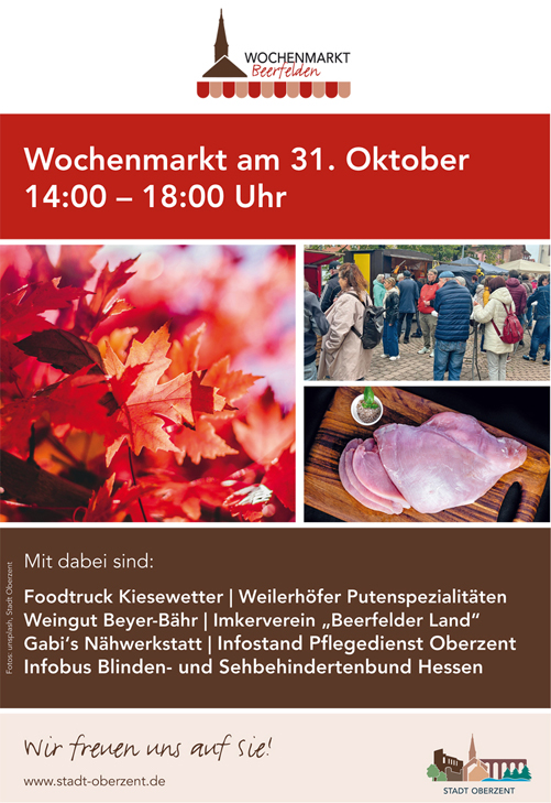 BEERFELDEN. – Zum Wochenmarkt am Freitag, 31. Oktober, in Beerfelden halten die Veranstalter einmal mehr besondere Angebote auch aus dem Non-Foodbereich bereit. Von 14 bis 18 Uhr erwarten die Marktbeschicker ihre Kunden vor der evangelischen Martinskirche.