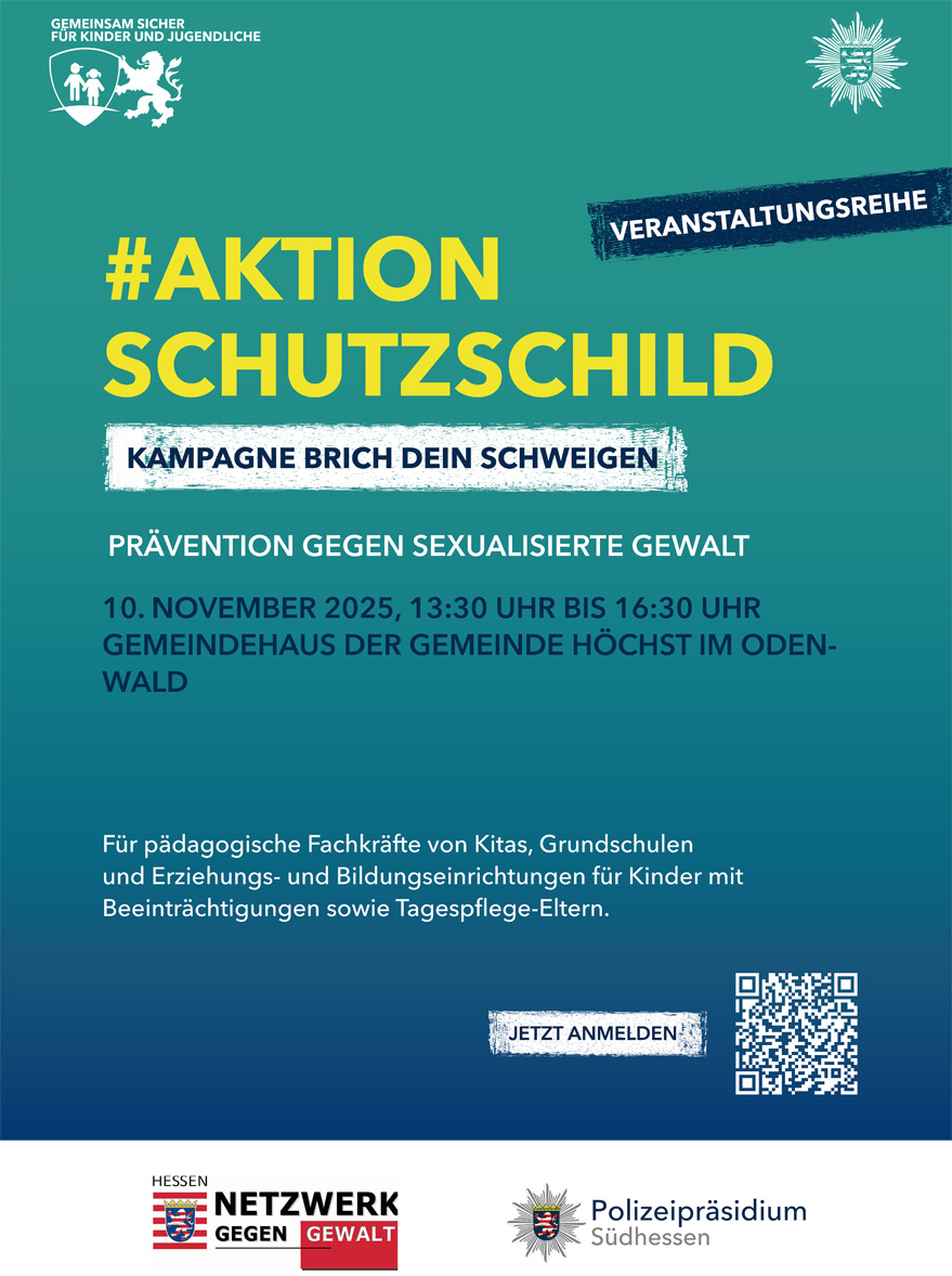 Am Montag, 10. November, von 13.30 bis 16.30 Uhr, findet daher im Gemeindehaus der Gemeinde Höchst die Auftaktveranstaltung zur #AKTION SCHUTZSCHILD der hessischen Polizei zum Schutz von Kindern und Jugendlichen vor sexuellem Missbrauch und sexualisierter Gewalt statt.