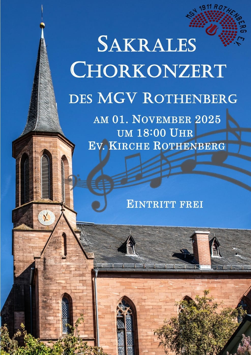 ROTHENBERG. – Der Männergesangverein Rothenberg lädt für Samstag, 01. November, ab 18 Uhr, ein zu einem sakralen Chorkonzert in der evangelischen Kirche Rothenberg. Bei freiem Eintritt präsentiert sich der vielstimmige Männerchor einmal mehr einem breiten Publikum in heimischer Umgebung.