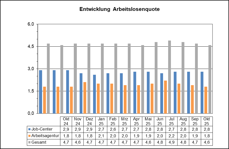 Betrachtet man die beiden Rechtskreise getrennt voneinander, ist im Vergleich zum September 2025 in der Zuständigkeit des Kommunalen Job-Centers (SGB II) ein Anstieg um 14 Personen auf 1.453 Personen zu verzeichnen (Vorjahresmonat 1.517).