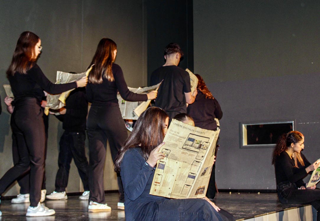 Anschließend präsentierten Schülerinnen und Schüler des DS-Kurses der Q-Phase unter der Leitung von Carsten Jonischkeit das szenische Spiel „Brauner Morgen“ nach dem gleichnamigen Text von F. Pavloff.