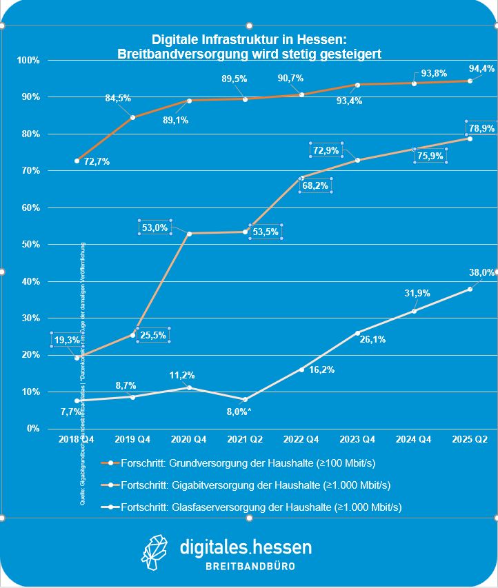 WIESBADEN. – Die aktuellen Zahlen des Gigabit-Grundbuchs des Bundes bestätigen die ungebrochen hohe Ausbaudynamik beim Glasfaserausbau in Hessen. Mit Stand Mitte 2025 surfen inzwischen rund 78,9 Prozent der hessischen Haushalte gigabitfähig (≥ 1.000 Mbit/s).