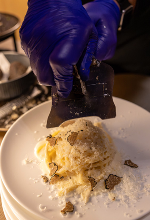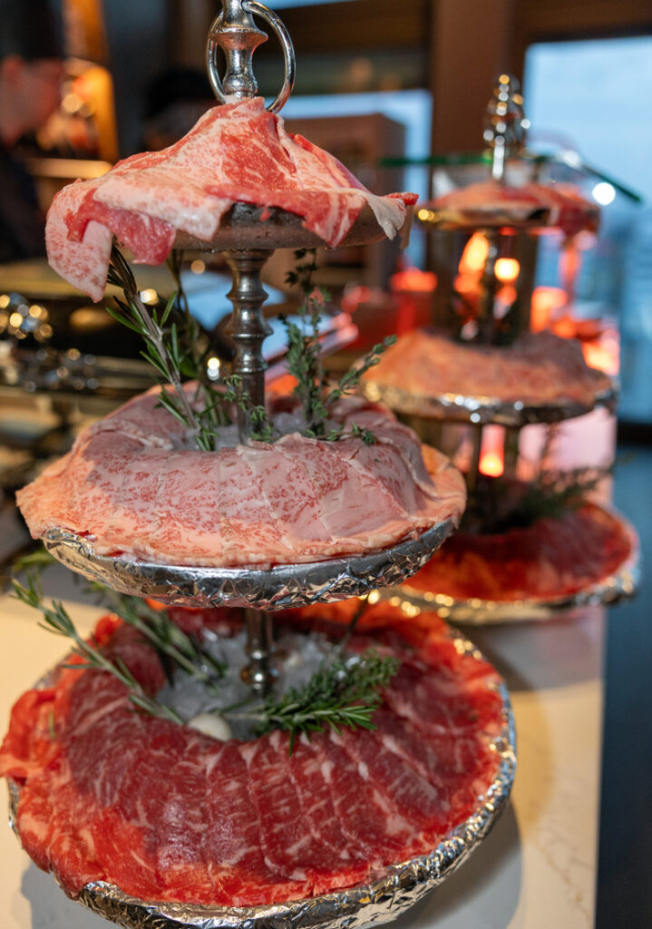 An den Food-Stationen sorgten Live-Cooking-Gerichte wie Tuna Tataki mit Avocado-Creme, Wagyu Teppanyaki mit Kartoffelpüree und Jus, Trüffel-Pasta aus dem Parmesanlaib oder eine erlesene Fromagerie de France für kulinarische Höhepunkte.