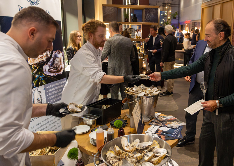 Dazu knackte das Team des FrischeParadies frische Austern, an der eigens dafür installierten Bar. Das süße Finale bildete die „Pâtisserie Live – Le Grand Finale“ mit Tartelettes in Vanille, Schokolade und Himbeere.