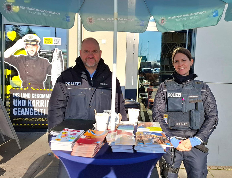 Doch nicht nur in Viernheim waren die Schutzleute vor Ort im Einsatz. Auch in Bensheim standen am Morgen und am Mittag der Schutzmann der örtlichen Polizeistation, Martin Runzheimer und seine Kollegin Lisa Lingenberg am Rewe-Markt, am Edeka-Markt und am Kaufhaus Ganz sowie am Netto-Markt in Zwingenberg mit ihren Informationsständen bereit und boten Beratungen an.