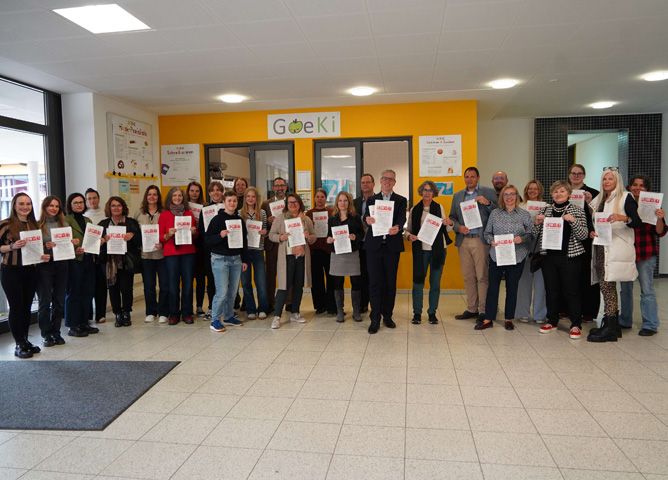 Landrat Christian Engelhardt (Mitte) gemeinsam mit dem Arbeitskreis gegen häusliche Gewalt im Kreis Bergstraße und weiteren Kooperationspartnern bei der Auftaktveranstaltung am Goethe-Gymnasium Bensheim.
