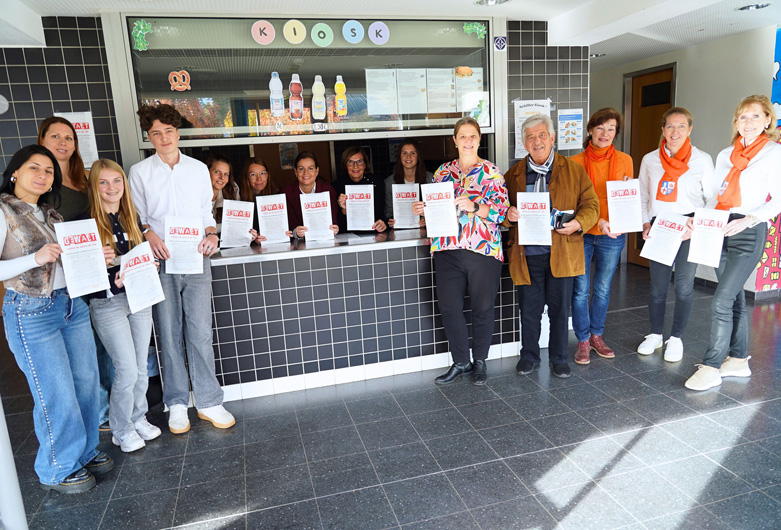 Die Kreisschülervertretung, Vertreter des Arbeitskreises gegen häusliche Gewalt im Kreis Bergstraße, Schulleiterin Sylvia Meier, der Kreisbeigeordnete Philipp-Otto Vock sowie das Präventionsteam des Kreises Bergstraße (von links) bei der Ausgabe der Brötchentüten an der Schillerschule Bensheim.