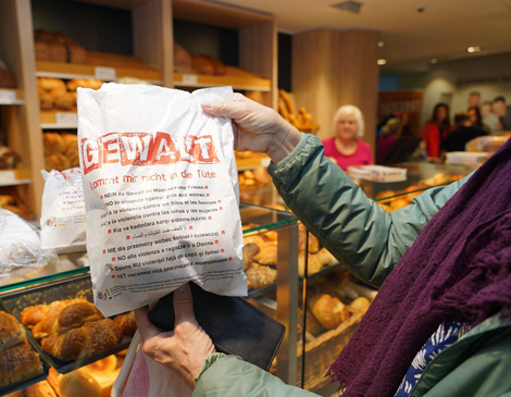 Die Brötchentüten wurden nicht nur mit der Aufschrift „Gewalt kommt mir nicht in die Tüte“ bedruckt. Auf der Rückseite finden sich zudem Notfallnummern und Hilfsangebote. Fotos: Pressedienst Bergstraße