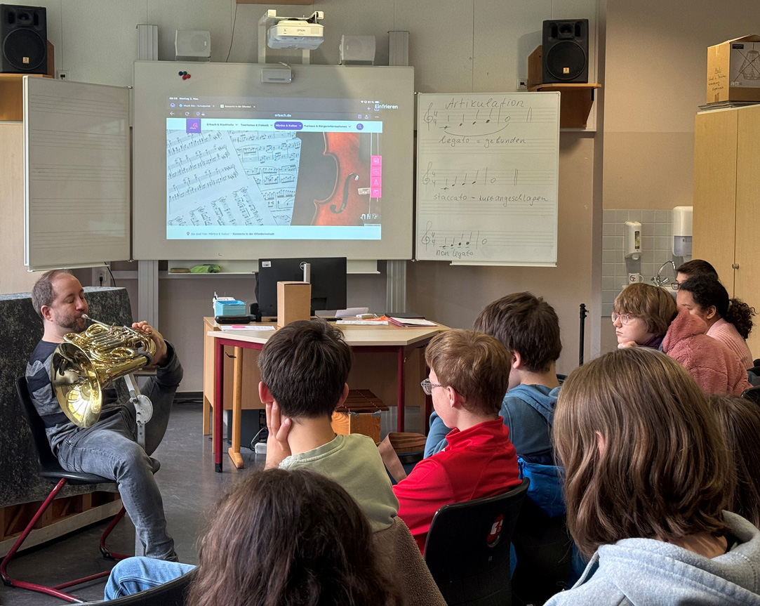 In einer lebendigen und eindrucksvollen Veranstaltung musizierte Felix Klieser vor den begeisterten Kindern und Jugendlichen und vermittelte zugleich spannende Einblicke in die Welt der Blasinstrumente. Mit anschaulichen Erklärungen und humorvollen Anekdoten zeigte er, wie Klänge entstehen und welche Besonderheiten das Hornspiel auszeichnen.