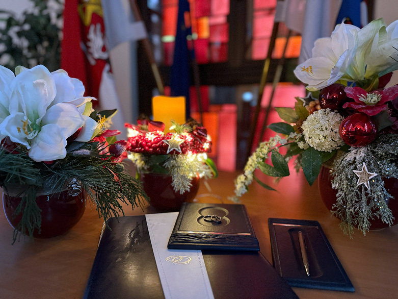 Im adventlich geschmückten Trausaal des Bensheimer Rathauses haben Kurzentschlossene jeweils freitags vor dem zweiten, dritten und vierten Advent (5., 12. und 19. Dezember) die Möglichkeit, sich um 16, 17 oder 18 Uhr trauen zu lassen. Foto: Presseidnet Bensheim