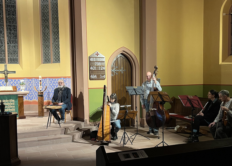 Reinhold Hoffmann (links) ist mit Urvater Adam in einen Dialog getreten – die von ihm verfasste Erzählung trug der Rothenberger Pfarrer nun in der Kirche vor. Unterstützt wurde er dabei von der Musikgruppe „Folks“. Foto: Bernhard Bergmann