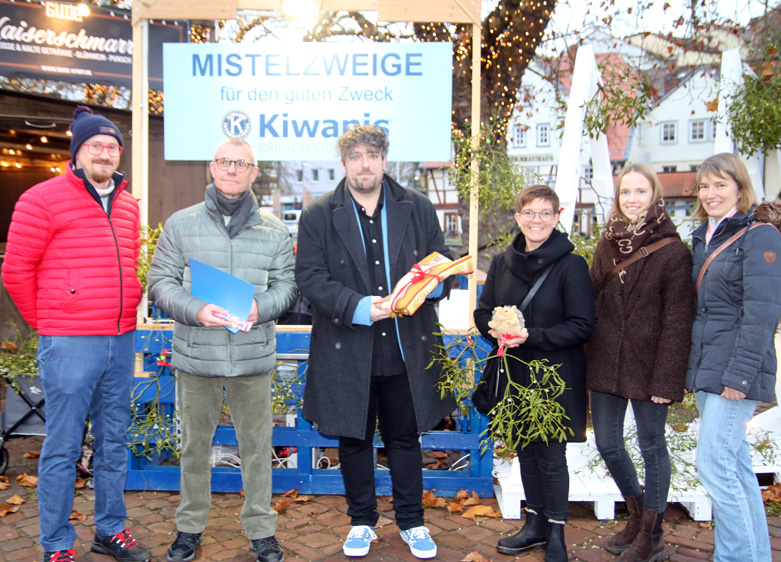 Am ersten Adventswochenende nutzte der Kiwanis Club Erbach/Odenwald den beliebten Mistelzweigverkauf in Erbach für zwei Geldübergaben in Form von einem Schnellhefter, einer Zahnbürste und einem Igel