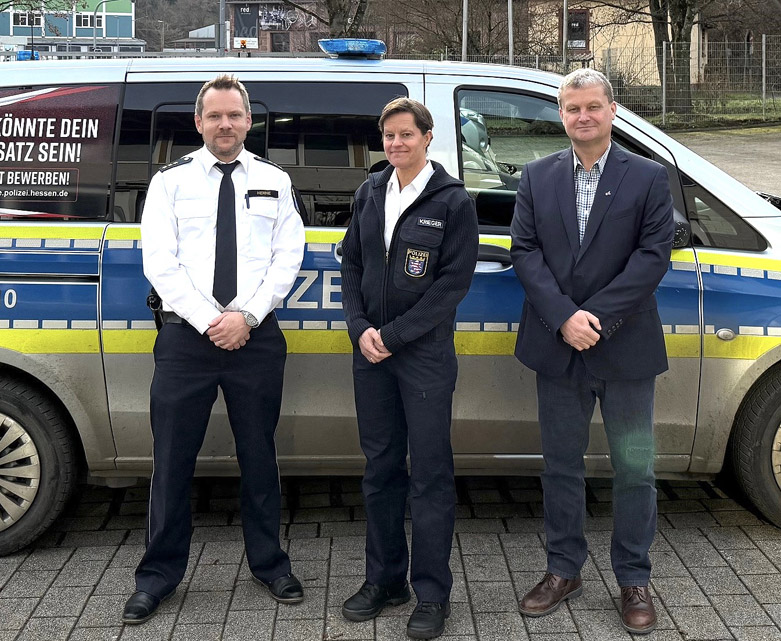 Der Leiter der Polizeidirektion Bergstraße, Kriminaldirektor Benjamin Henne (links) und der Leiter der Polizeistation Wald-Michelbach, Erster Kriminalhauptkommissar Markus Keßler (rechts) begrüßen gemeinsam die neue Schutzfrau vor Ort, Kriminaloberkommissarin Tina Krieger. Foto: Pressedienst Polizeipräsidium Südhessen