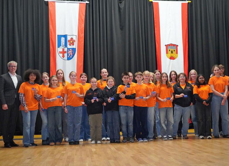 Goethe-Gymnasium Bensheim: Landrat Christian Engelhardt (links) mit den ehrenamtlichen Schulsanitätern vom Goethe-Gymnasium Bensheim, denen der Landrat in Einhausen die Ehrenamts-Card überreichte.