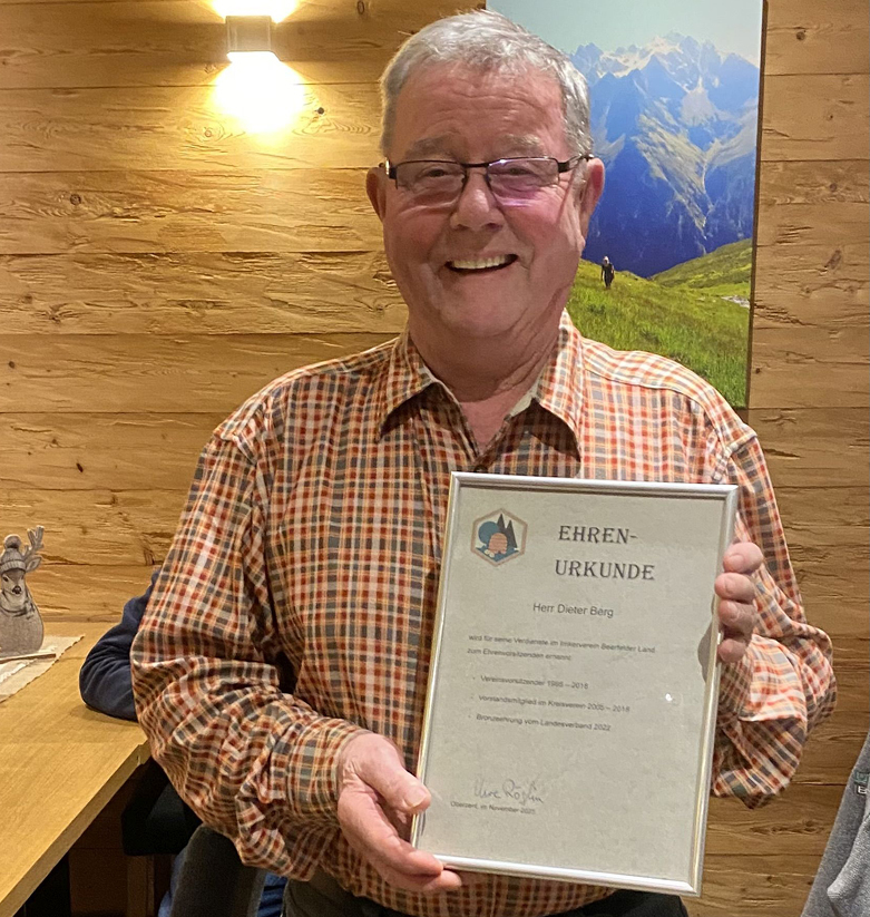 Dieter Berg ist und bleibt ein geschätztes Mitglied des Vereins, das durch die langjährige Erfahrung in der Bienenhaltung und der Vereinsarbeit neuen wie erfahrenen Imkern mit Rat und Tat zur Seite steht.