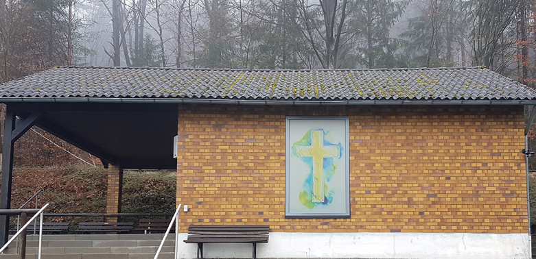 Um das alte Kreuz aus Glasbausteinen aufzugreifen und dem Raum die nötige Würde zu verleihen, wurde das Fenster mit einer Motivfolie beklebt. Der Ortsbeirat bedankt sich bei Andrea Drerup für die Gestaltung des Motivs und bei der Stadt Oberzent für die Kooperation.