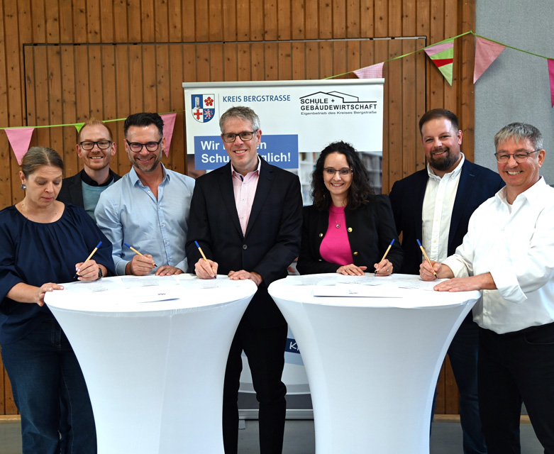 Mit der Unterschrift unter der Dreiecksvereinbarung haben Schulleiterin der Schillerschule Auerbach, Sylvia Meier, Technischer Betriebsleiter des Eigenbetriebs Schule und Gebäudewirtschaft, Johannes Kühn, Markus Dehoust Leiter von GaBiBe, Landrat Christian Engelhardt, Nadide Sen-Clausen, Schulleiterin der Schlossbergschule, stellvertretender Kaufmännischer Betriebsleiter, Marc Colin und der Leiter von KuBuS e. V., Thomas Jungfleisch (von links) die Zusammenarbeit besiegelt. Foto: Pressedienst Bergstraße