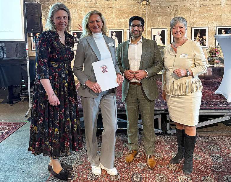 Bei der Übergabe des Förderbescheids: Tatjana Steinbrenner, Vizepräsidentin des Handelsverbands Hessen und Präsidentin des Handelsverbands Hessen-Süd, Marion Reiser, Teamleiterin Stadtmarketing Bensheim, Wirtschaftsminister Kaweh Mansoori und Bürgermeisterin Christine Klein (von links) bei der Übergabe des Zuwendungsbescheids in Frankfurt. Foto: Pressedienst Stadtmarketing Bensheim