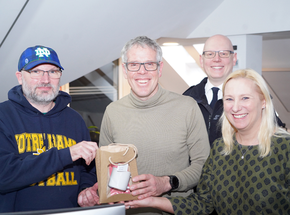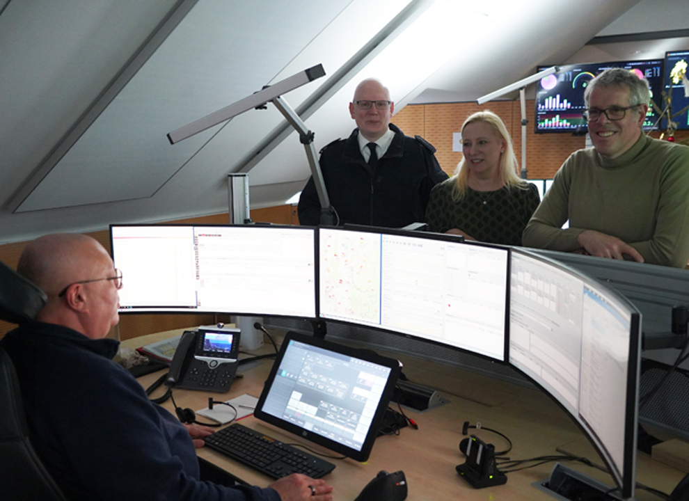 Überbrachten symbolisch ein großes Dankeschön: Landrat Christian Engelhardt (Mitte) und Diana Stolz (Hessische Ministerin für Familie, Senioren, Sport, Gesundheit und Pflege) in der Leitstelle des Kreises Bergstraße mit Markus Stracke und Frank Dostert (links).