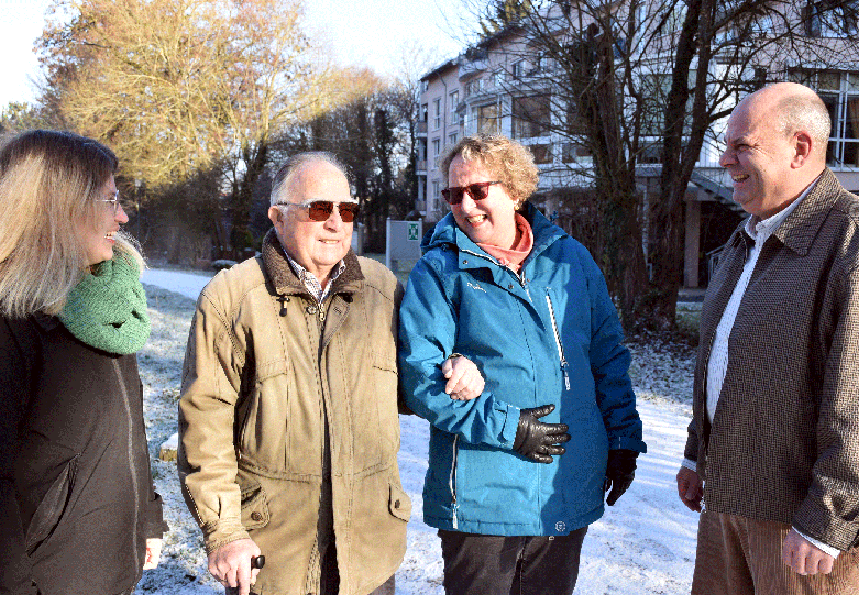 Gut gelaunt: Der Erste Kreisbeigeordnete Oliver Grobeis (rechts) und Eva Wieck, Leiterin der Abteilung Soziale Sicherung (links), im Gespräch mit dem 89 Jahre alten Dieter Hofmann und dessen Tochter Sylvia Hofmann bei einem Spaziergang im Kurpark von Bad König. Dieter Hofmann wohnt unweit vom Park in einer Seniorenresidenz. Er ist Witwer und vor zwei Jahren aus Norddeutschland in den Odenwald gezogen, wo seine Angehörigen leben. Foto: Saskia Hofmann/Kreisverwaltung